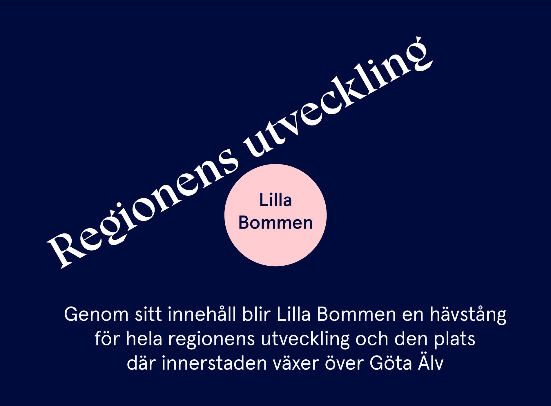 Vår strävan är att Lilla Bommen blir ett levande och färgstarkt område. En plats med såväl lokal som internationell prägel där nyfikenhet och drivkraft låter nya idéer testas, länkas samman och bidra till stadens och regionens utveckling. En optimistisk och internationell innerstad vid vattnet. Egentligen är det ganska naturligt – Lilla Bommen och hamnen har historiskt alltid varit en plats dit människor kommit för att umgås, köpslå, arbeta och få en bit av världen. Utvecklingen låter oss bygga vidare på platsens utåtriktade historia med plats för alla.