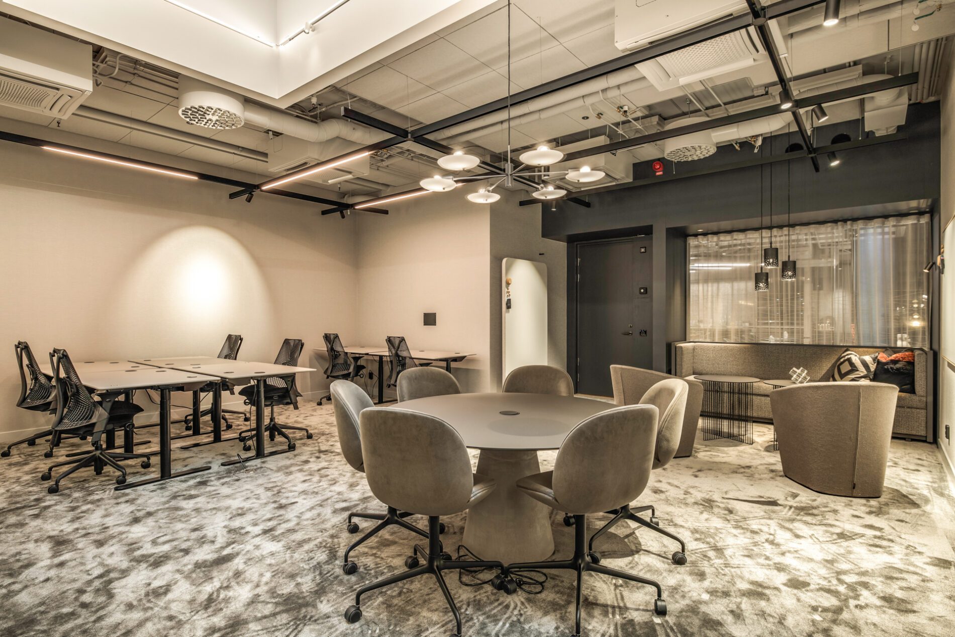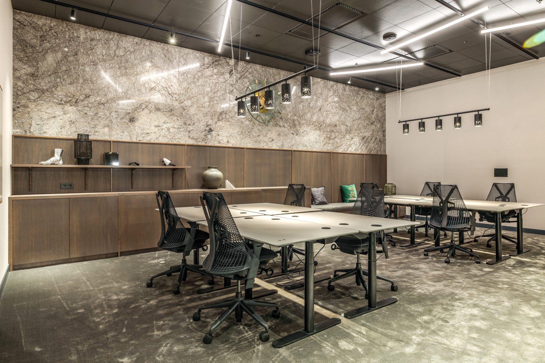 Rymligt arbetsrum möblerat med arbetsbord och skrivbordsstolar i två grupper. I rummet finns också en separat sittbänk och avlastningsyta. Rummet finns på markplan med utsikt mot gemensamma arbets-och mötesytor.