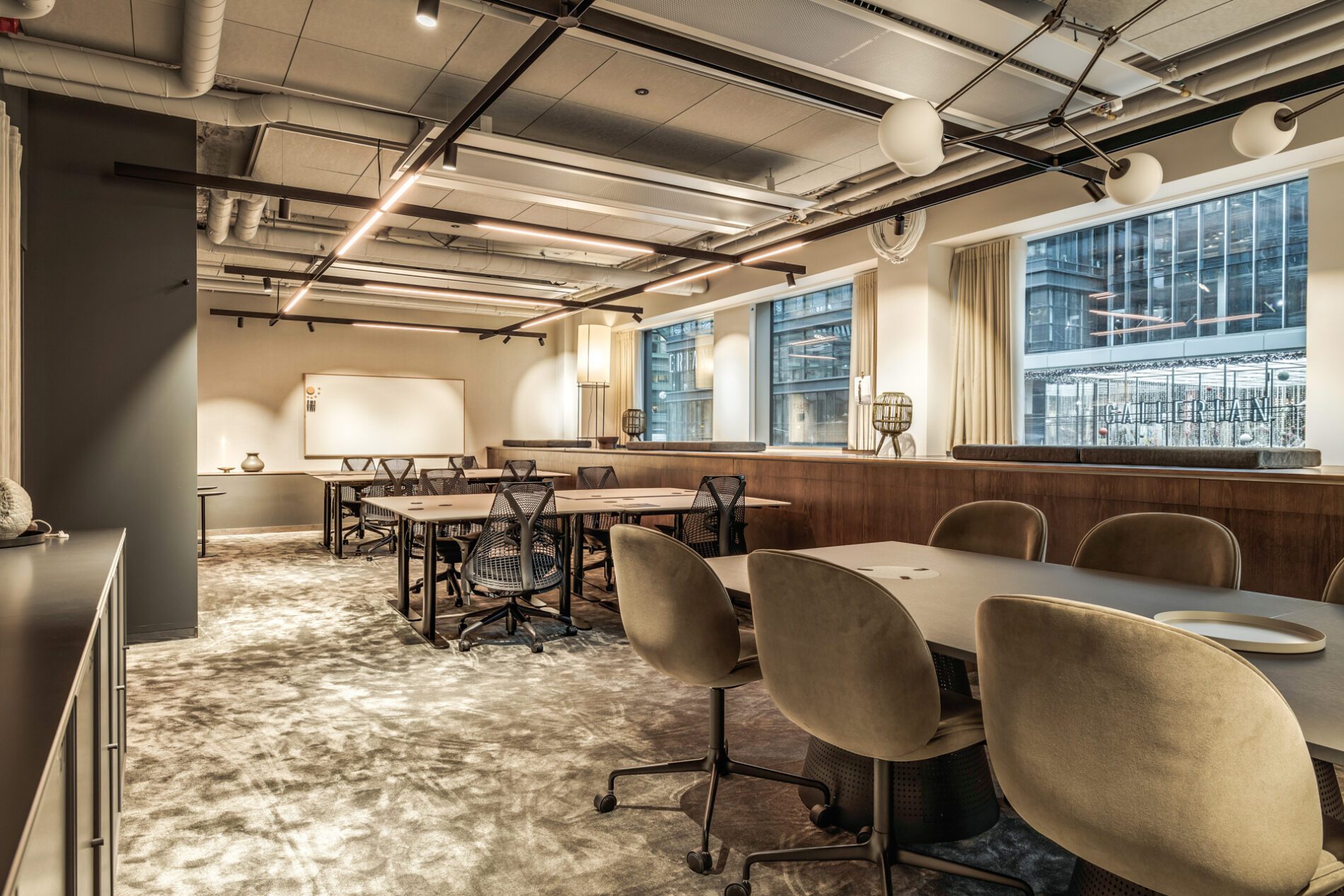 Möblering: Arbetsbord, skrivbordsstolar och separat sittbänk.