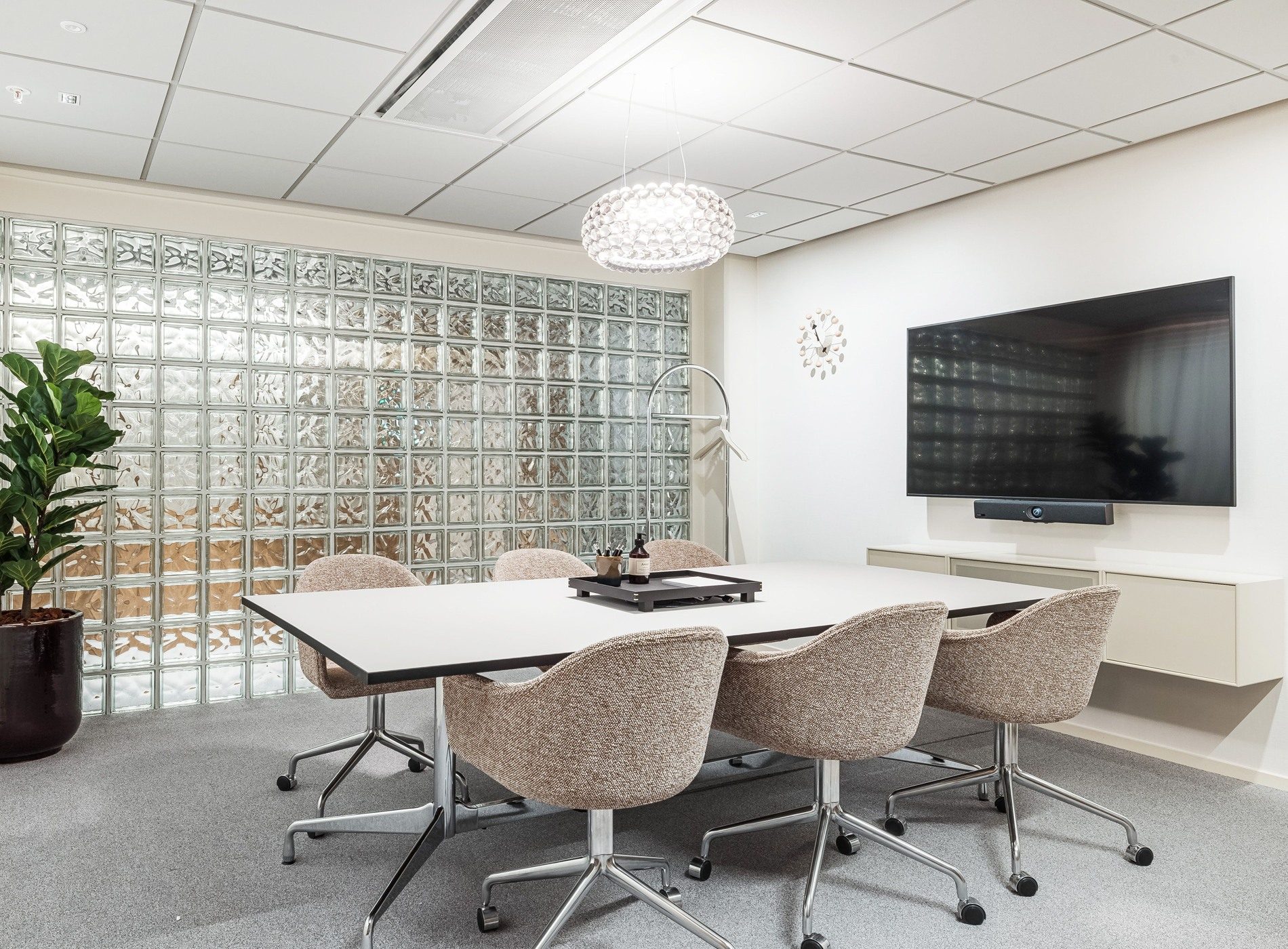Möblering: Avlångt konferensbord och stolar.