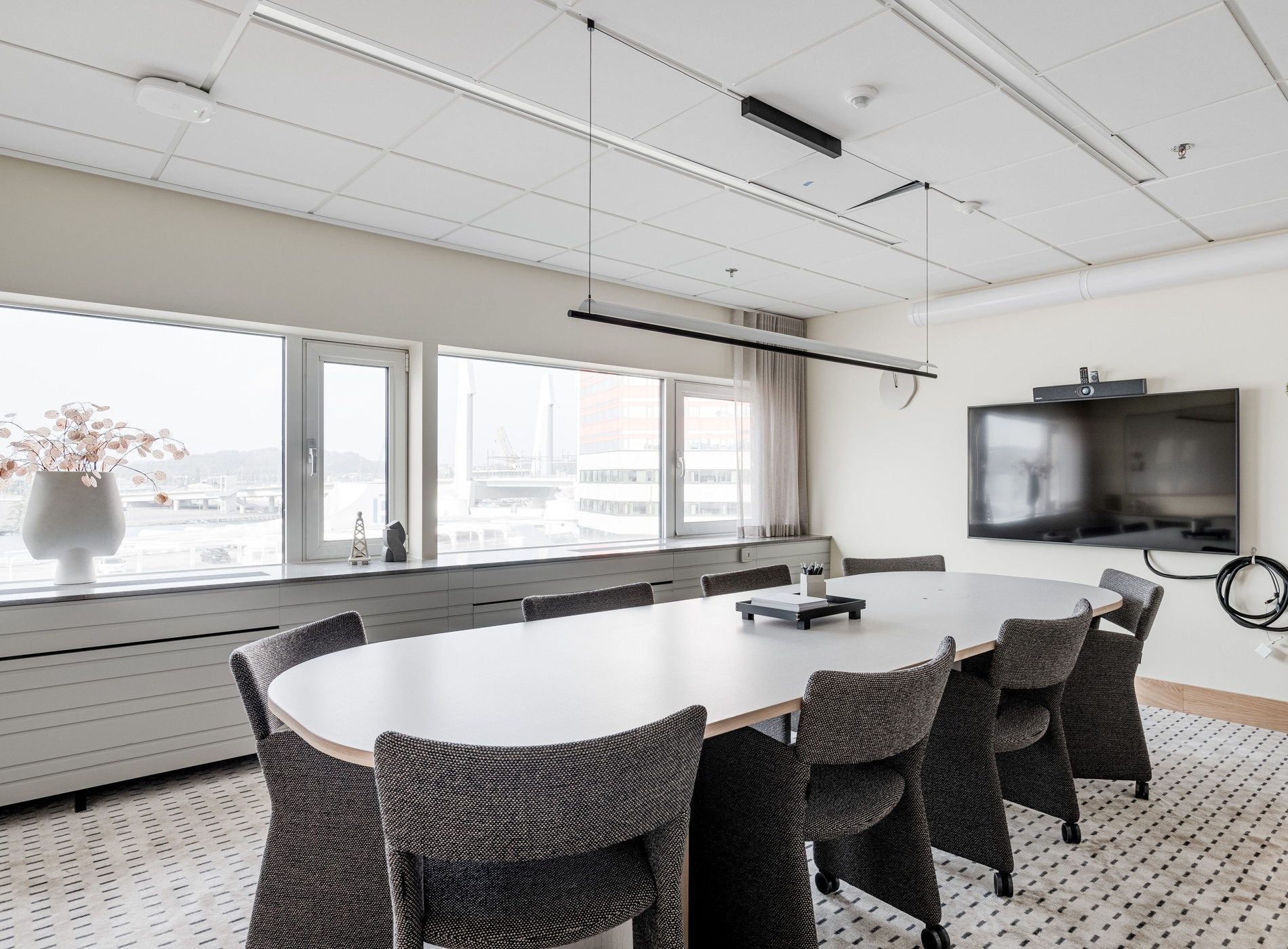 Utrustning: Whiteboard, skärm, videokonferensutrusning, högtalarsystem och sekretessgardin.