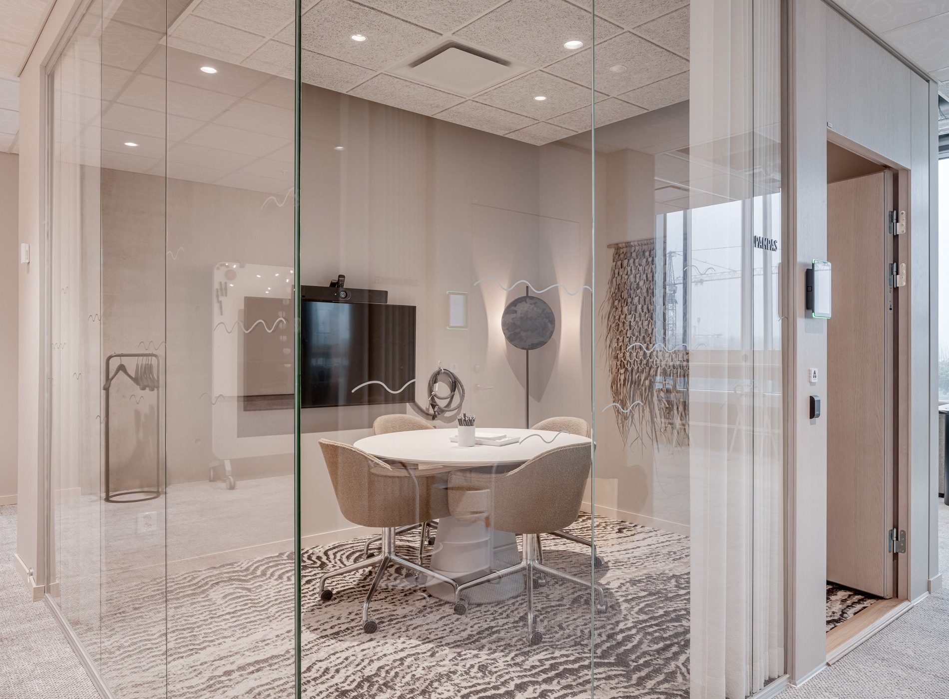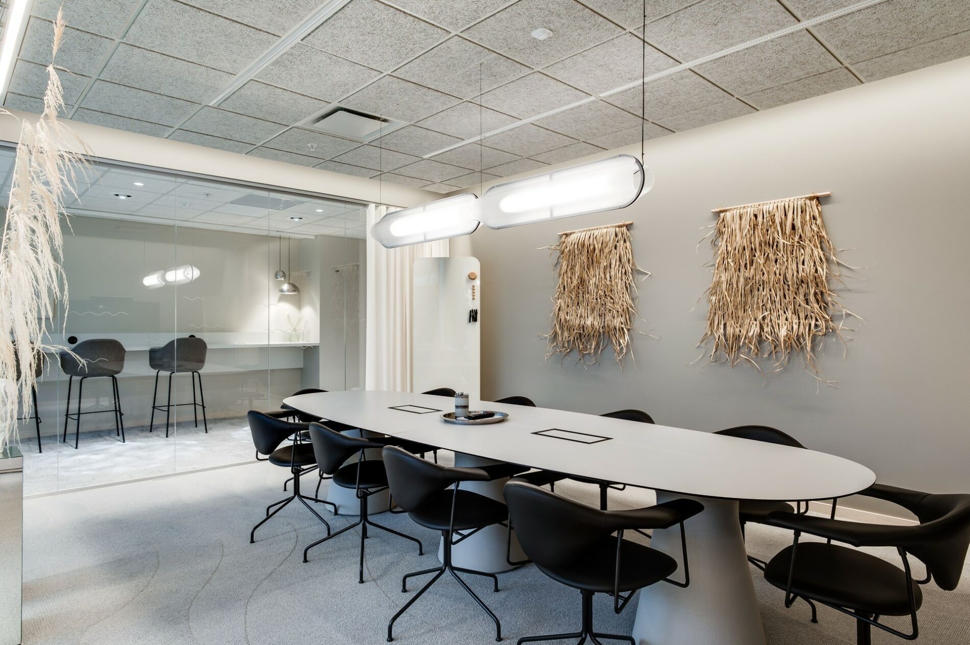 Ljust och rymligt rum med härligt ljusinsläpp. Rummet är möblerat med ett avlångt konferensbord och sköna stolar.