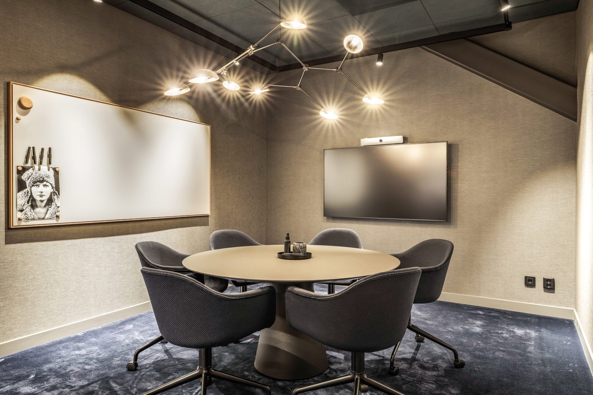 Charmigt mötesrum i grått, silver och blått. Rummet har glaspartier mot de gemensamma sitt- och mötesytorna på mellanplanet och är möblerat med ett runt mötesbord och stoppade karmstolar.