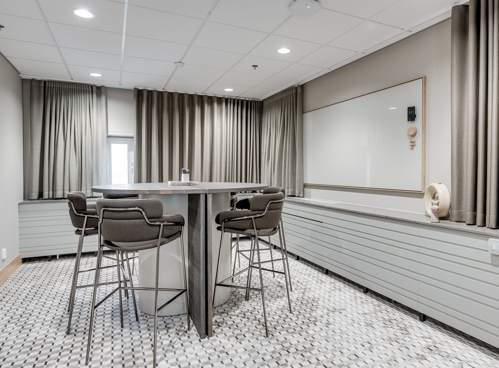 Mysigt och ombonat rum för det mindre mötet. Möblerat med två mindre halvmåneformade bord för flexibla möteskonstellationer.