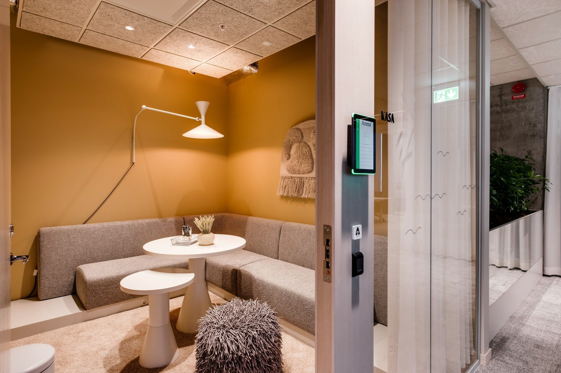Ett mötesrum för det mindre mötet. Inrett med platsbyggd hörnsoffa, soffbord och sittpuff. Rummet kan ta upp till 4 personer.