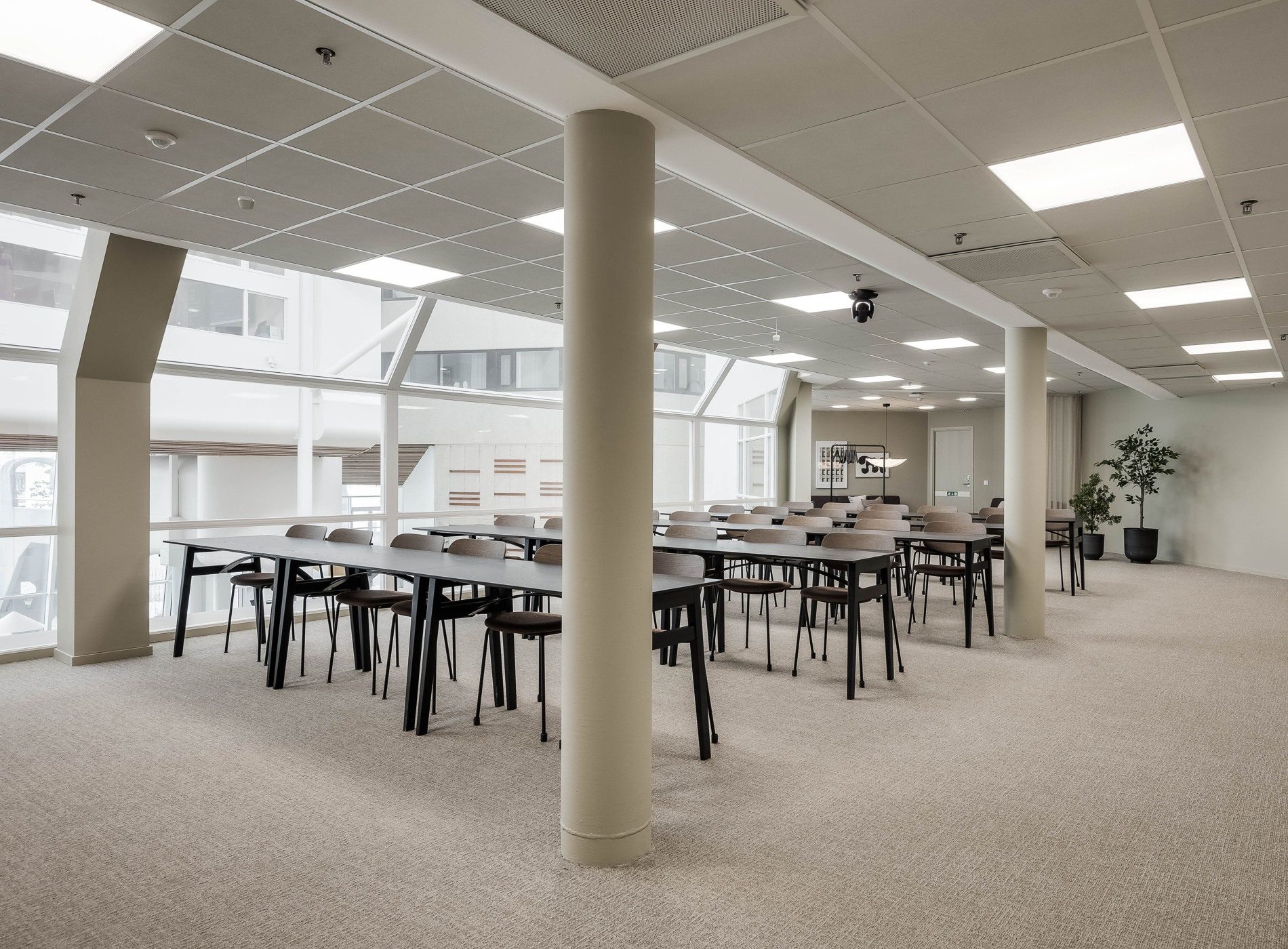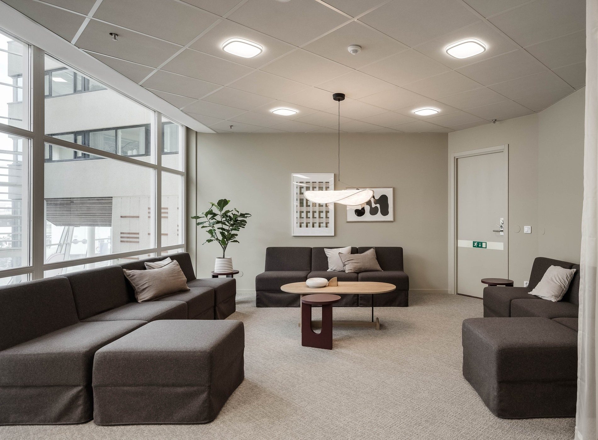 Ljust mötesrum med utsikt över Läppstiftets atriumgård och hamninloppet. Längst in i rummet finns en mysig loungedel dit man kan dra sig tillbaka för en kopp kaffe eller för jobb.