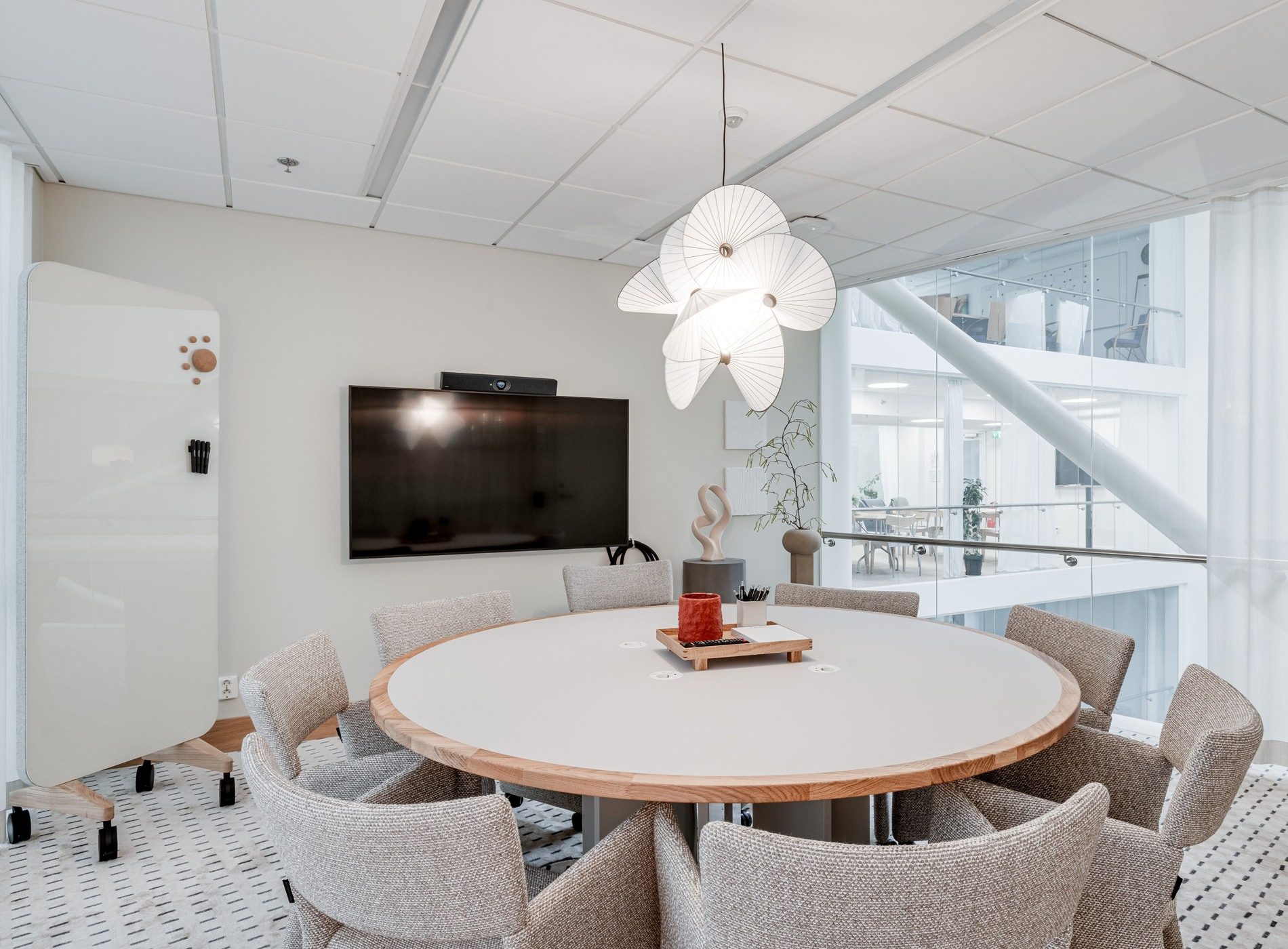 Utrustning: Whiteboard, skärm, videokonferensutrusning, högtalarsystem och sekretessgardin.