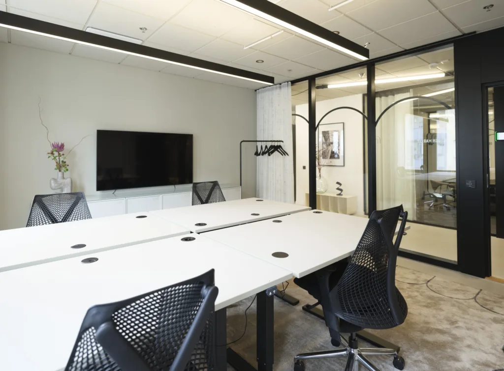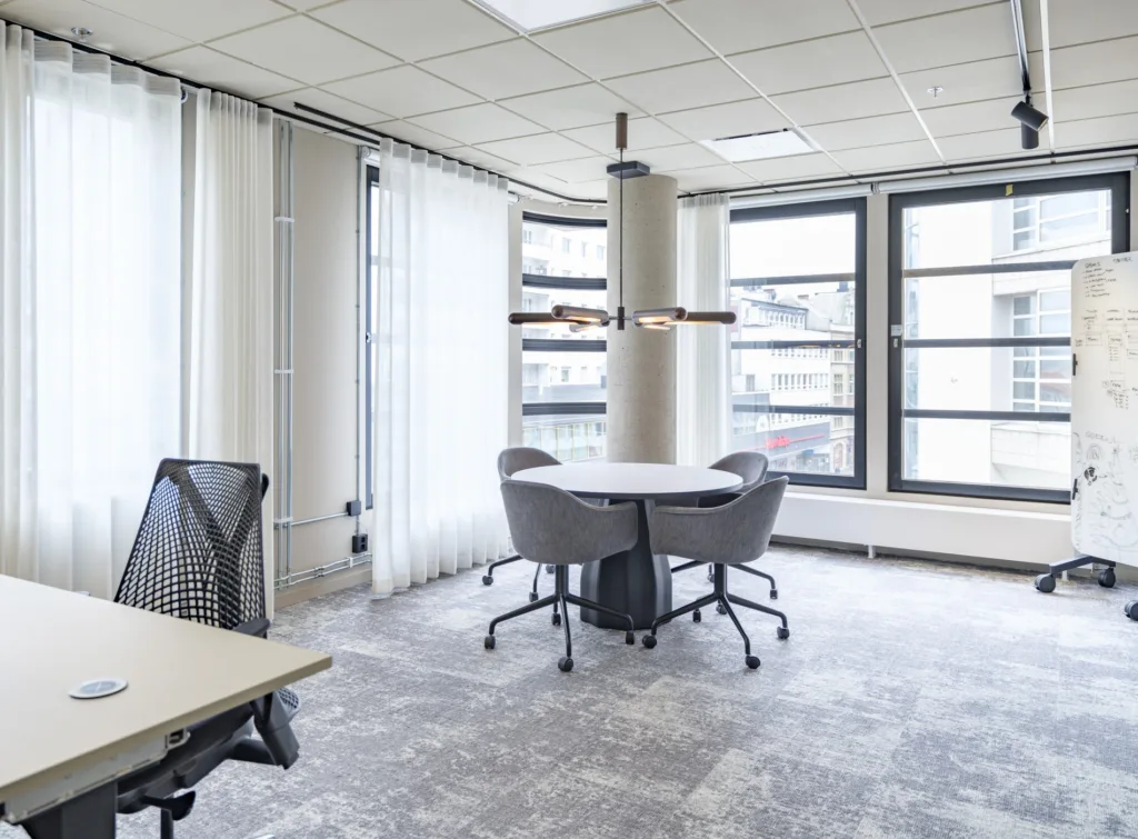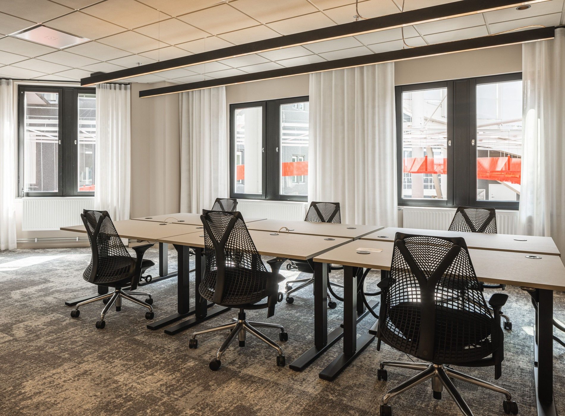 Möblering: sex höj- och sänkbara skrivbord placerade mot varandra samt runt bord med loungestolar.