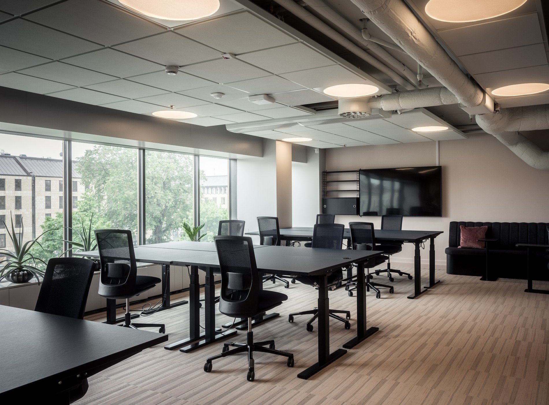 Möblering: Skrivbord och reglerbara kontorsstolar.