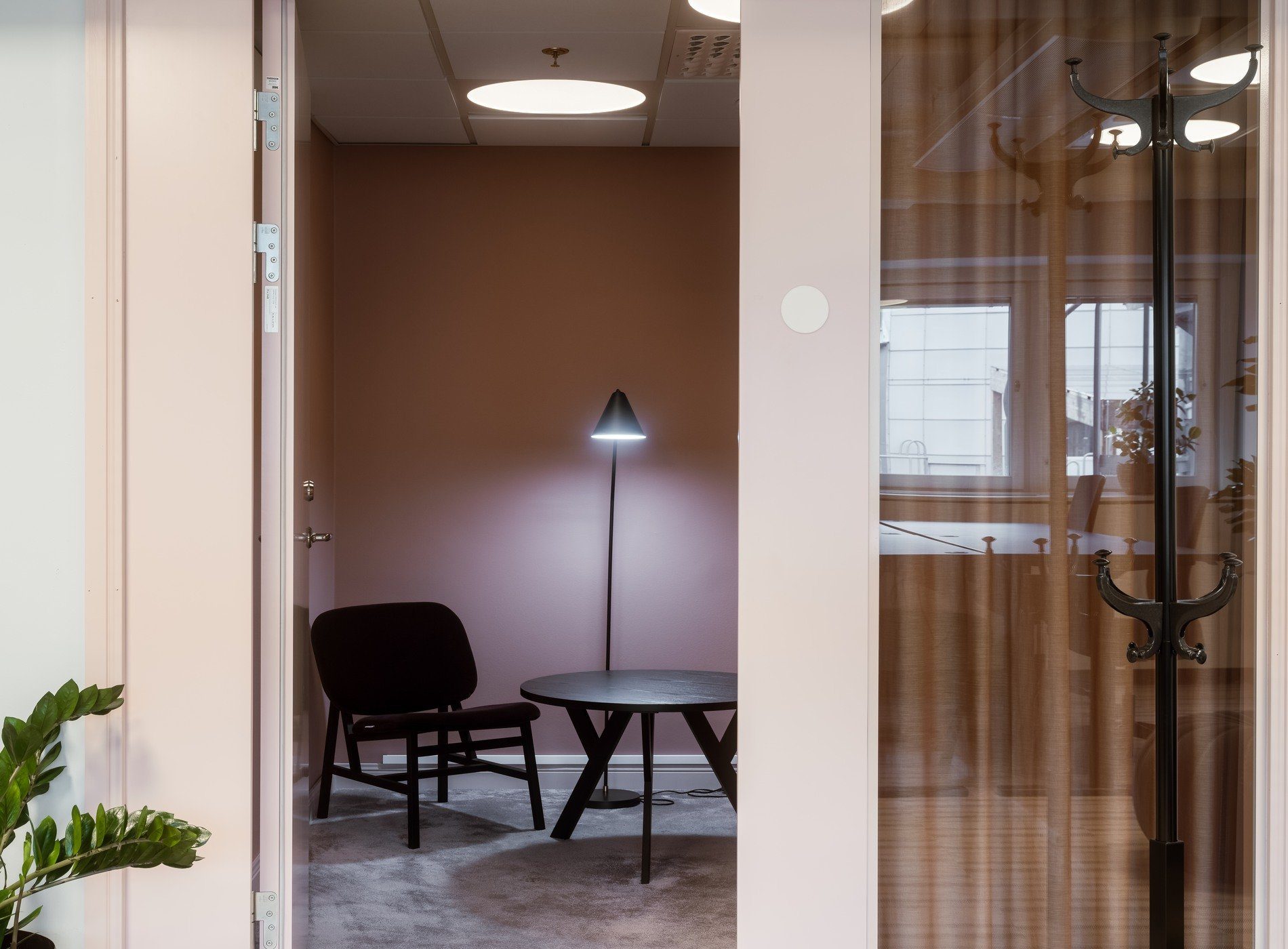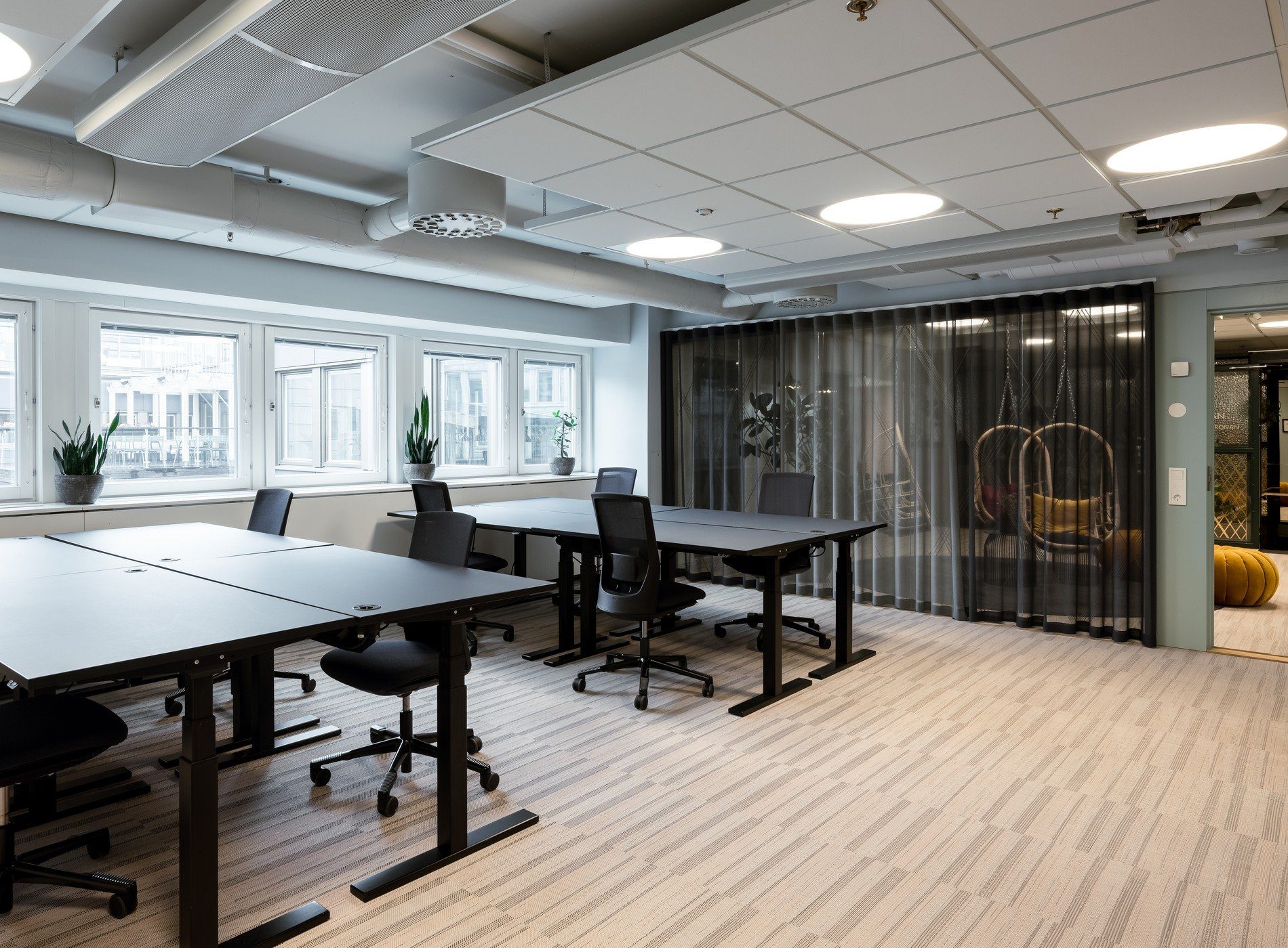 Ljust och rymligt rum med utsikt mot den grönskande innergården. Möblerat med åtta höj- och sänkbara skrivbord och reglerbara kontorsstolar. I detta rum finns även en platsbyggd soffa och ett eget samtalsrum.