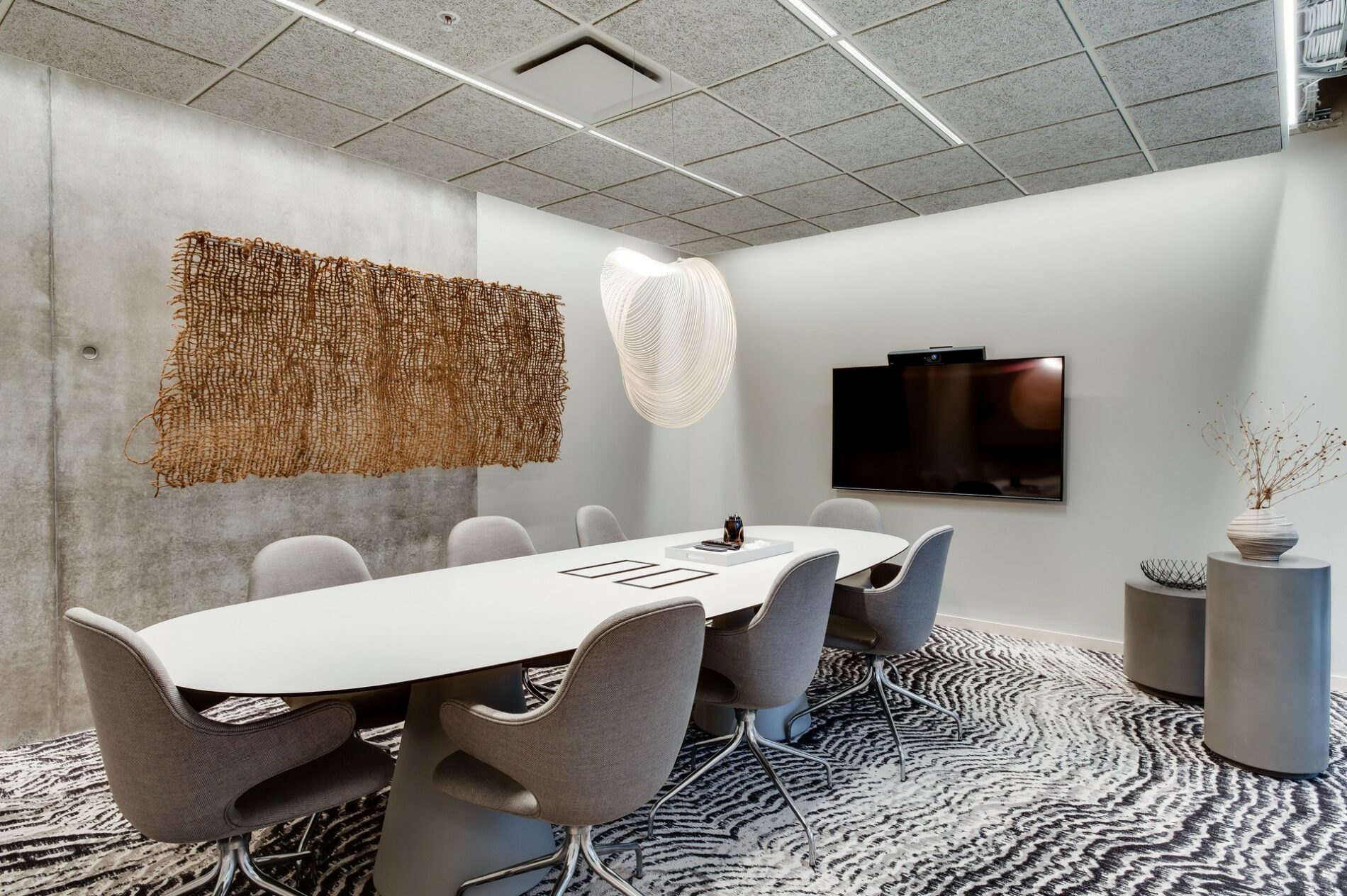 Ljust och rymligt rum med härligt ljusinsläpp. Rummet är möblerat med ett avlångt konferensbord och sköna stolar.