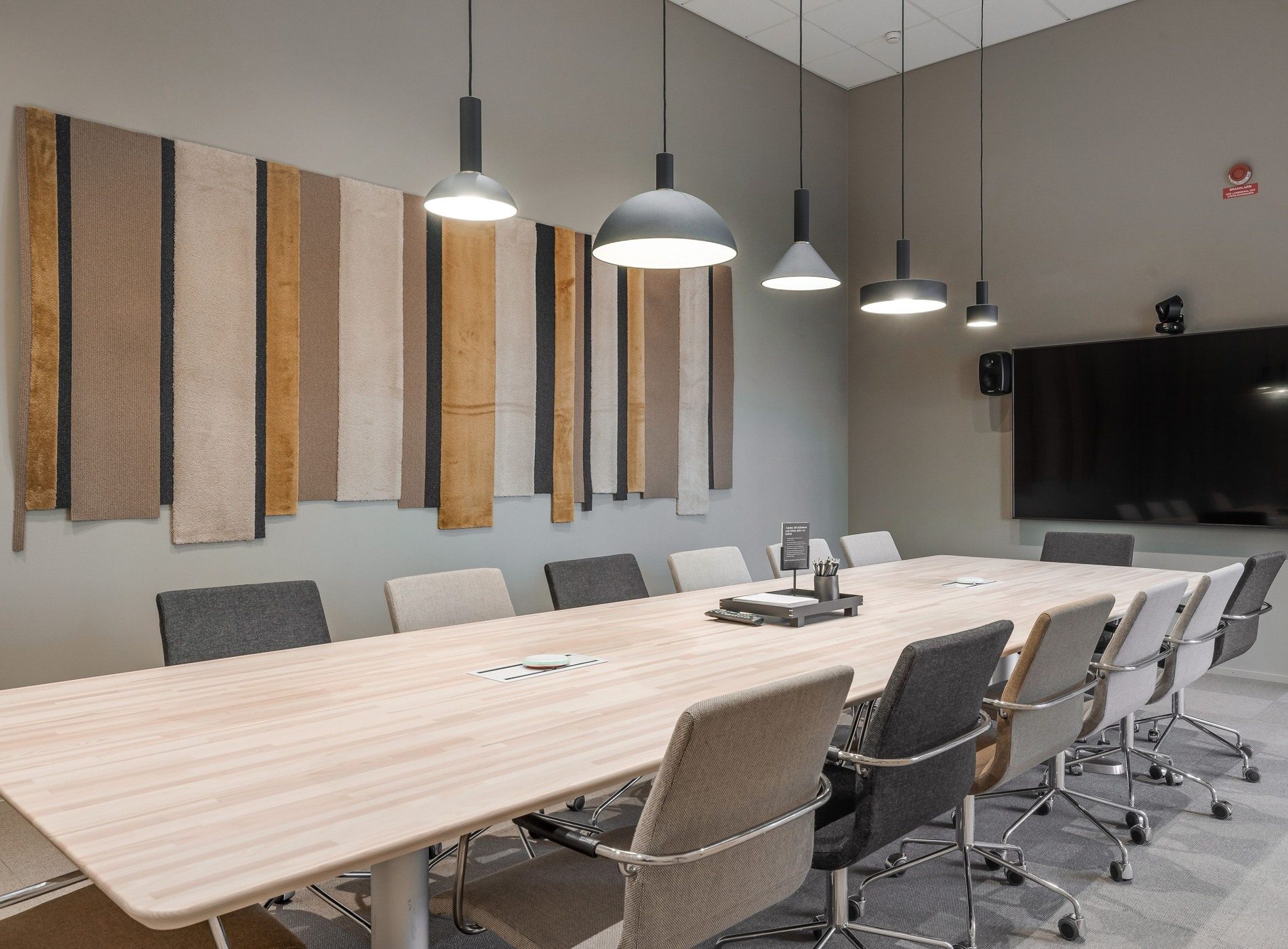 Möblering: Styrelsesittning, stoppade karmfåtöljer och avlångt mötesbord.