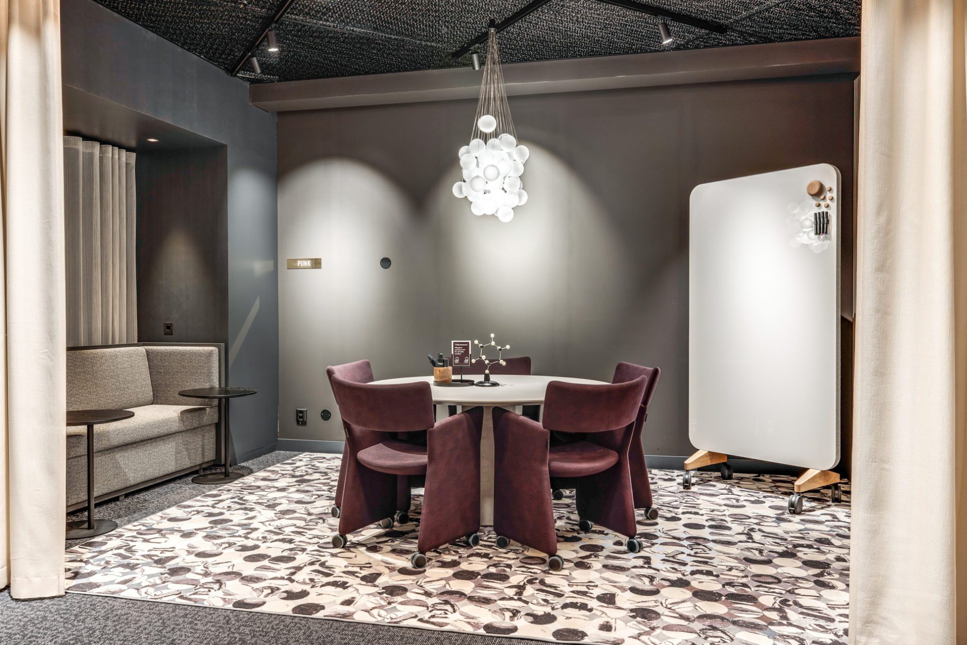 Rymligt och färgglatt mötesrum som enkelt avskiljs från de gemensamma arbets- och mötesytorna med ett draperi. Möblerat med ett runt bord och stoppade karmstolar. Rummet finns på entréplan med utsikt mot gemensamma arbets-och mötesytor.