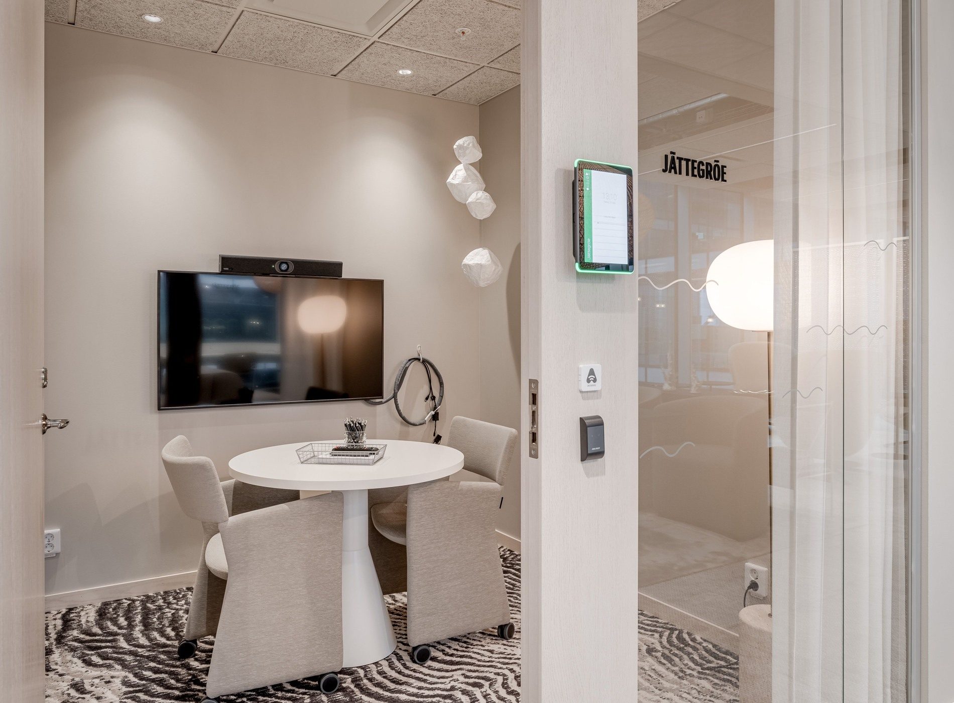 Ett mötesrum för det digitala mötet utrustat med skärm, kamera och belysning för det professionella teamsmötet.