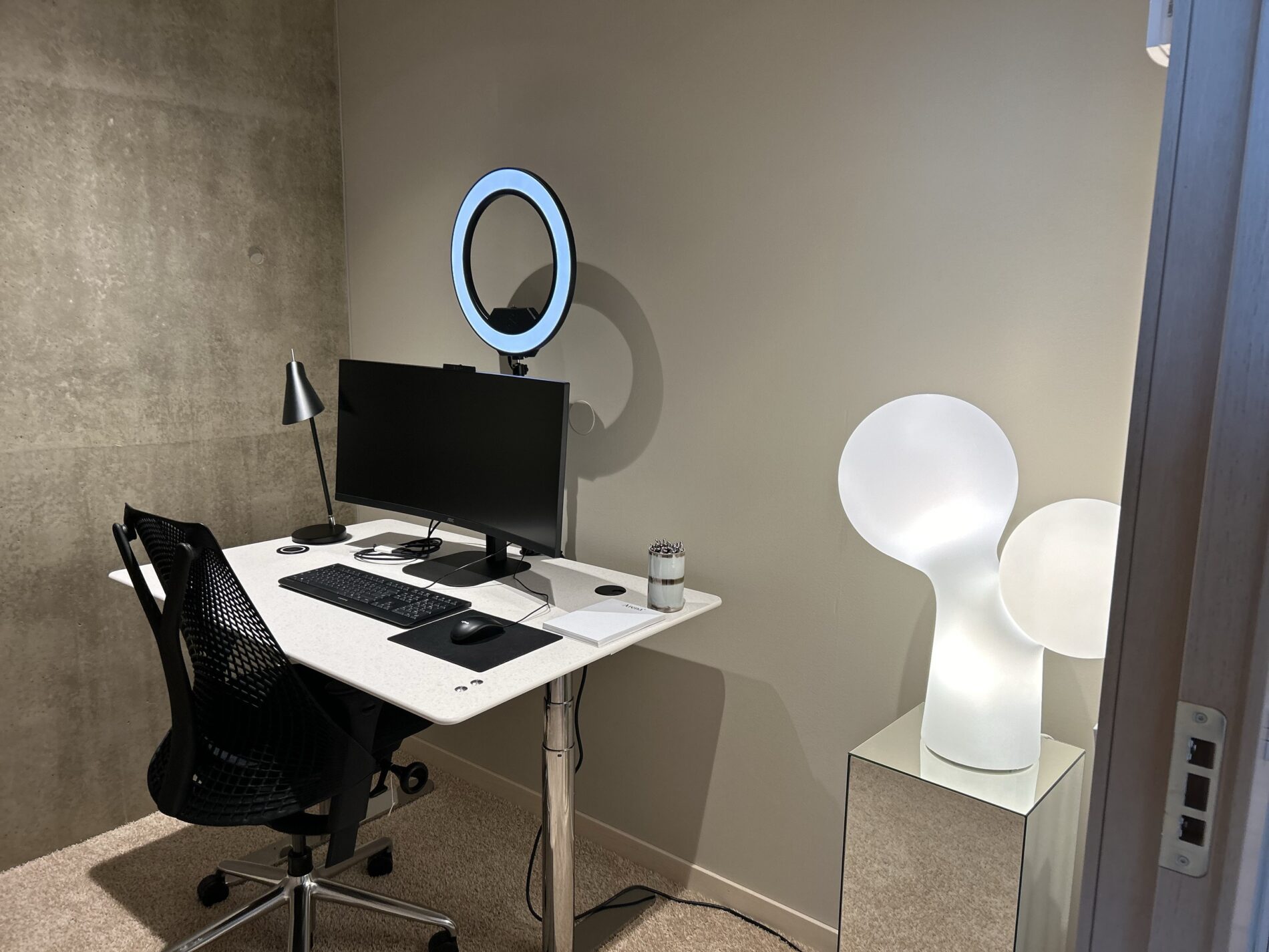 Utrustning: Skärm, kamera, ring light-belysning och sekretessgardin.