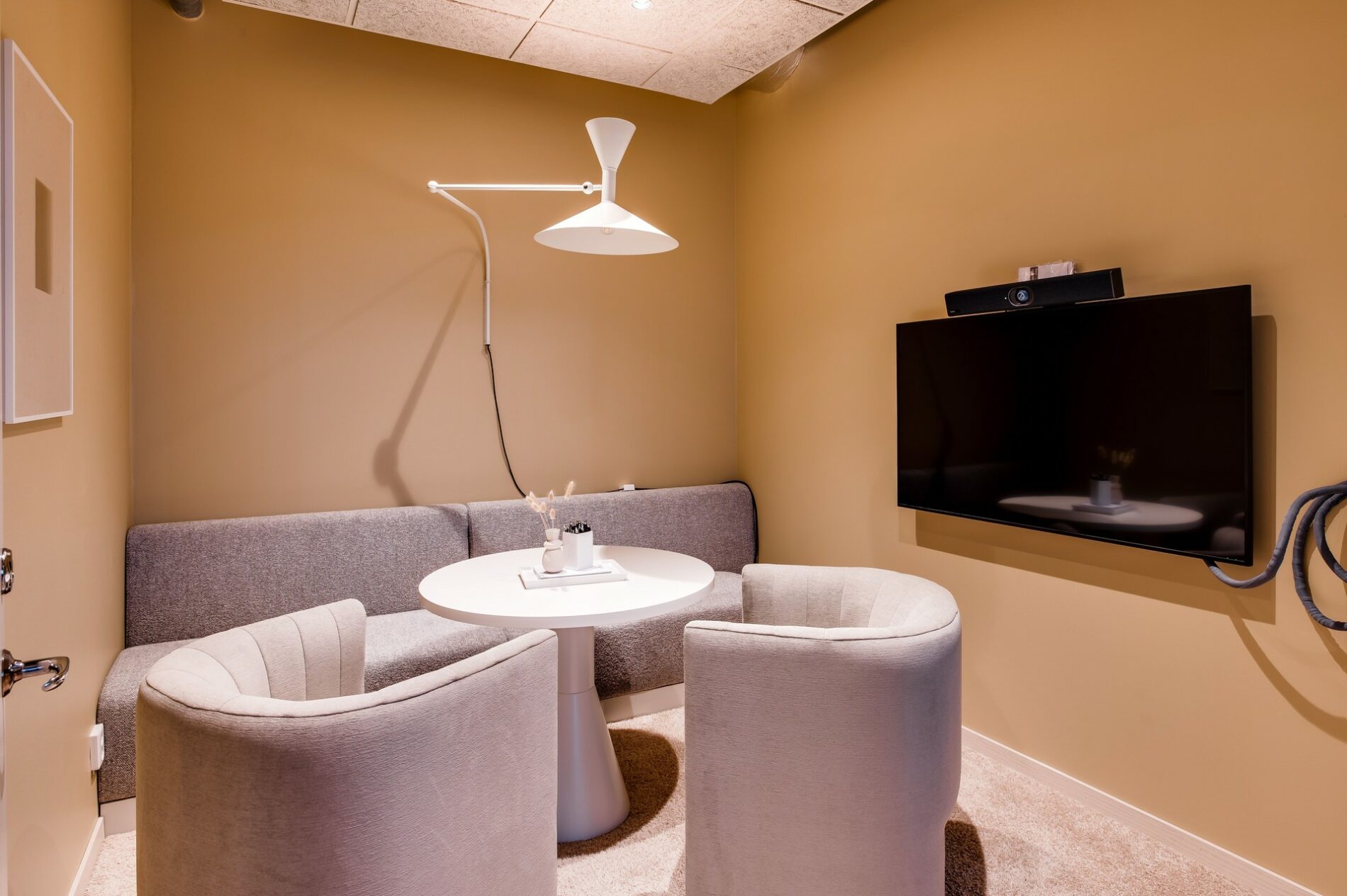 Ett mötesrum för det mindre mötet. Inrett med platsbyggd soffa, soffbord och fåtölj. Rummet kan ta upp till 4 personer.