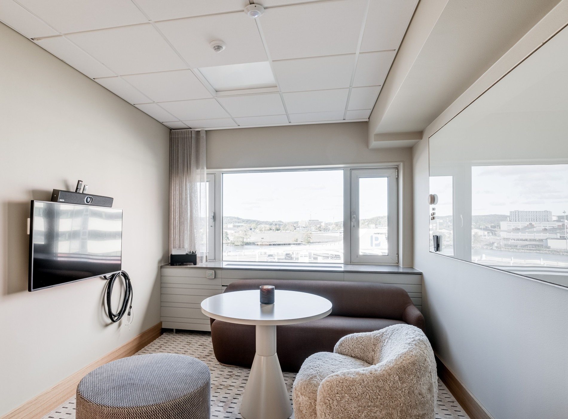 Mysigt mötesrum med utsikt över Göteborgs hamn. Möblerat med runt bord, stolar/fåtöljer och hörnsoffa.