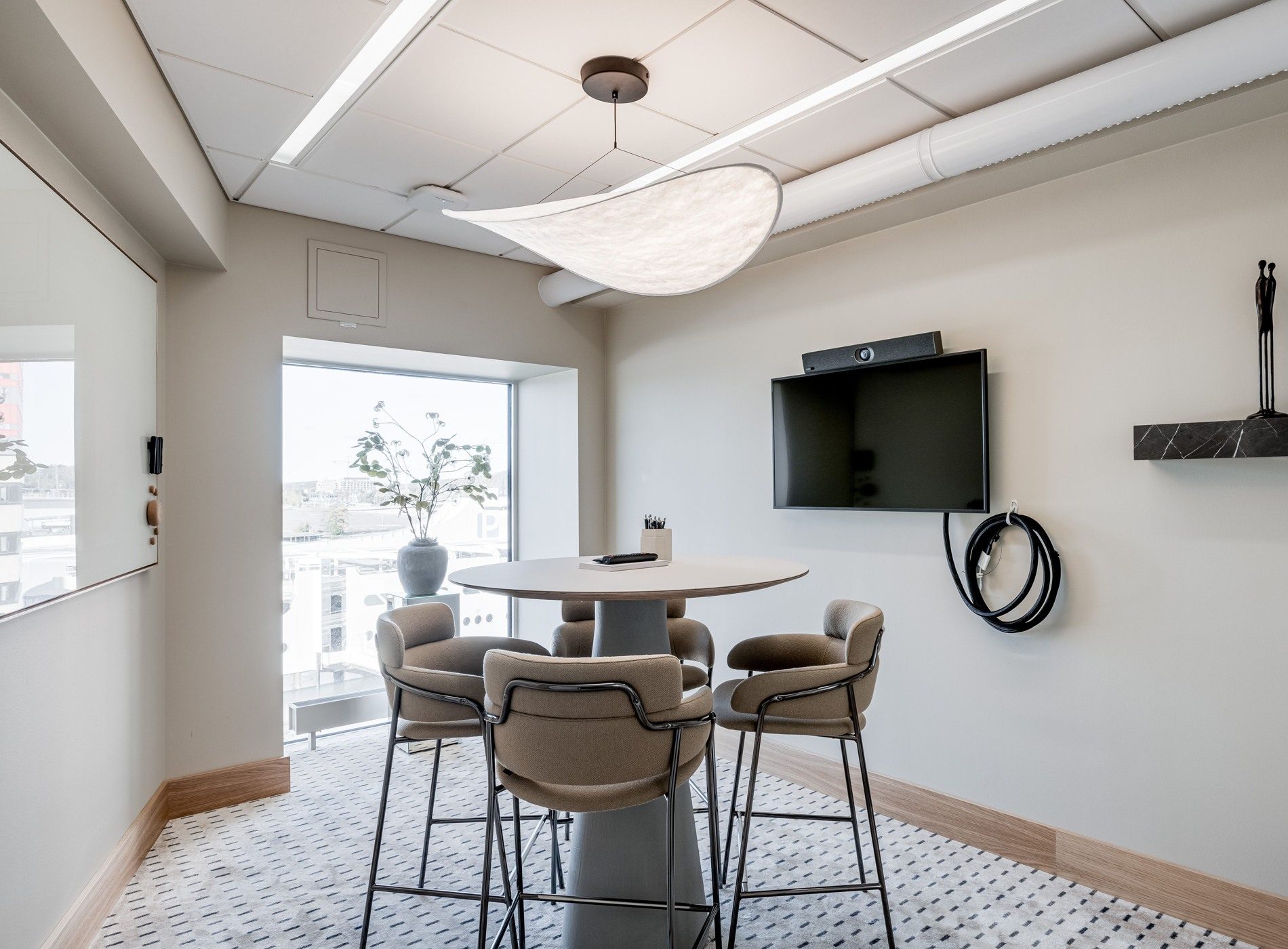 Ljusinsläpp från golv till tak i ett rum perfekt för det lilla mötet. Möblerat med runt bord och stolar.