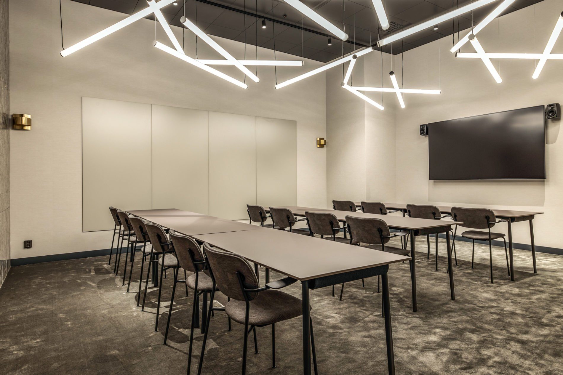 Utrustning: Whiteboard, skärm, videokonferensutrusning, högtalarsystem och sekretessgardin.